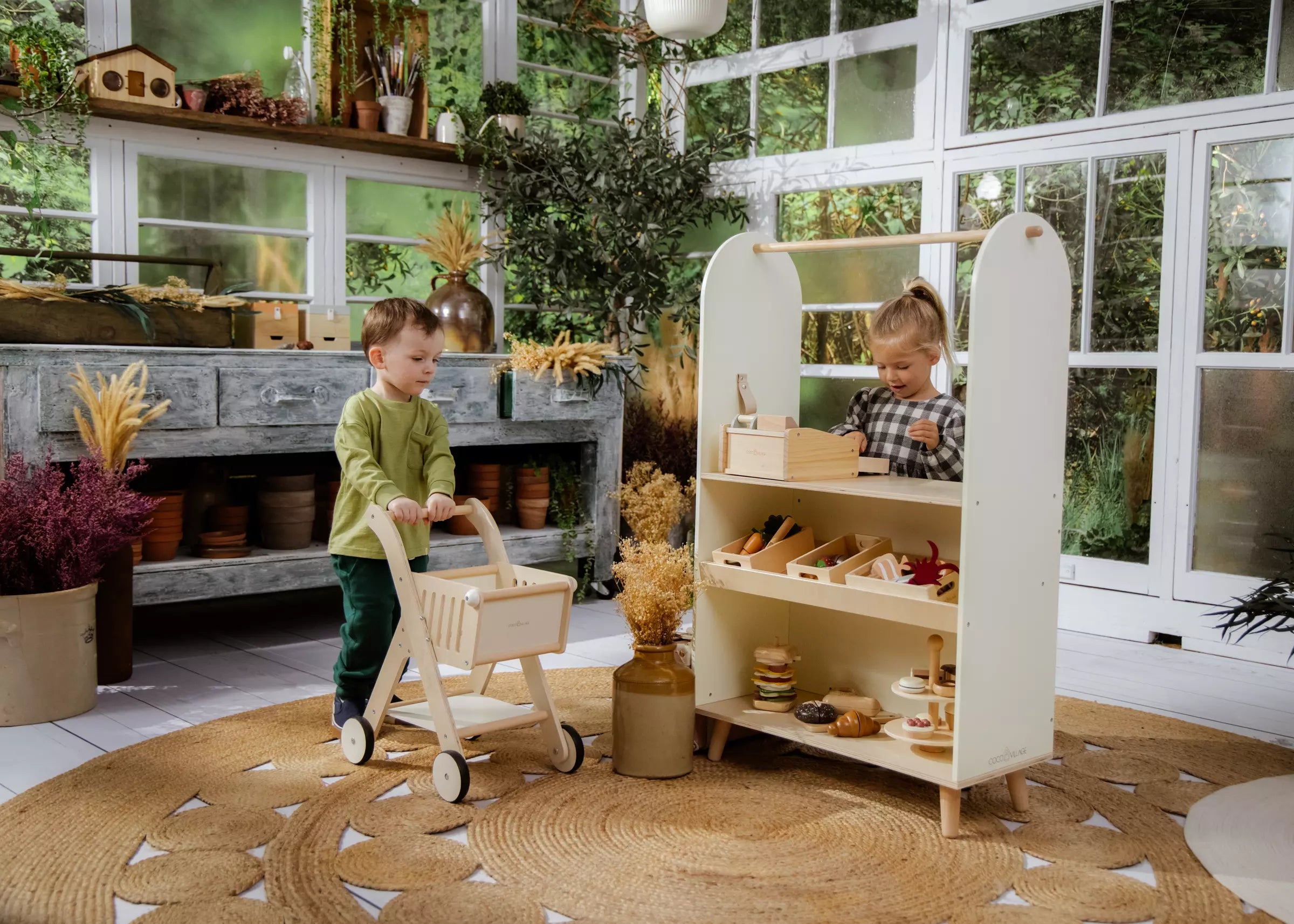 The perfect shopping cart. I love wooden toys. They last forever. The cart has storage on the bottom as well for groceries.I highly recommend. Easy assembly.
