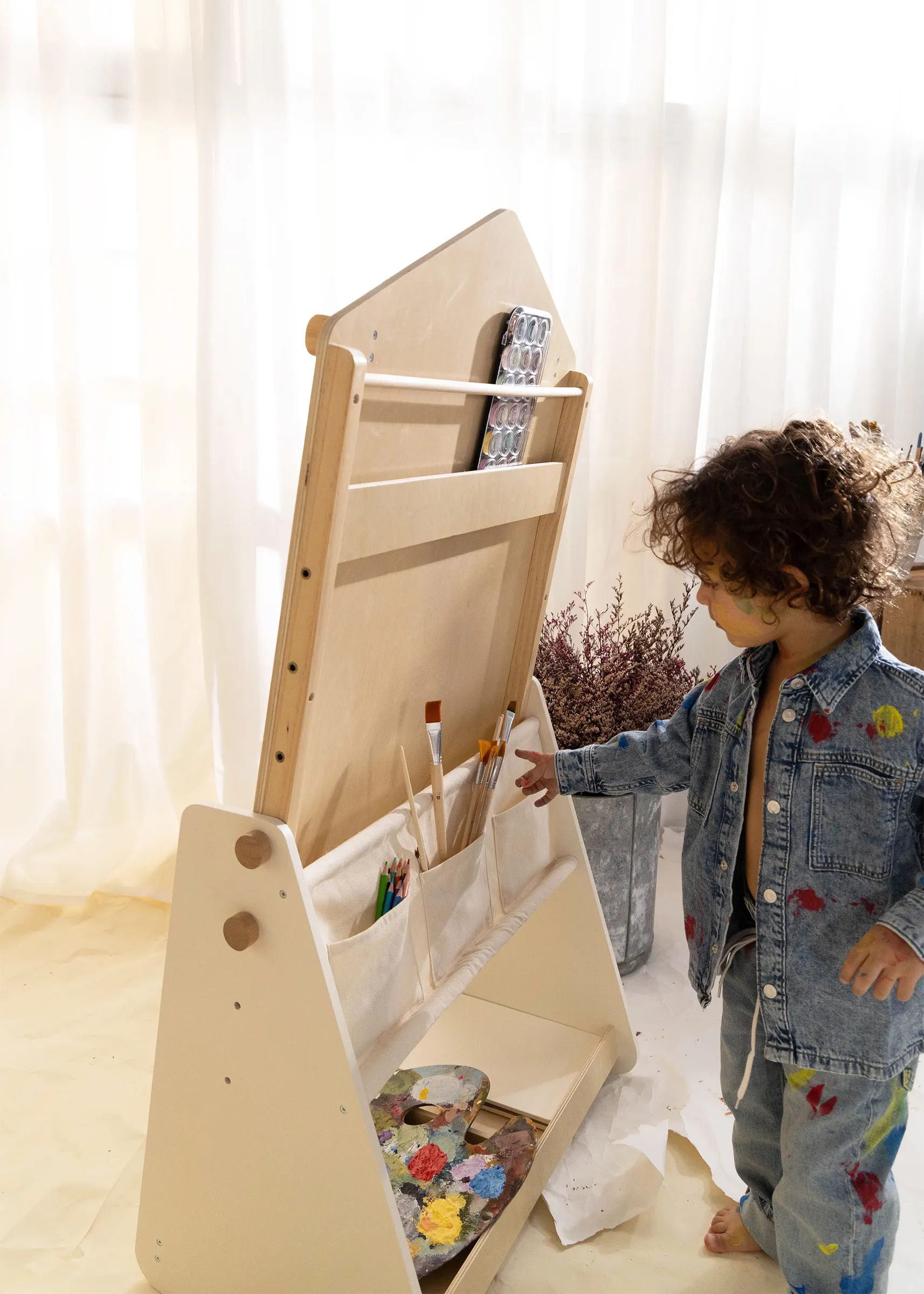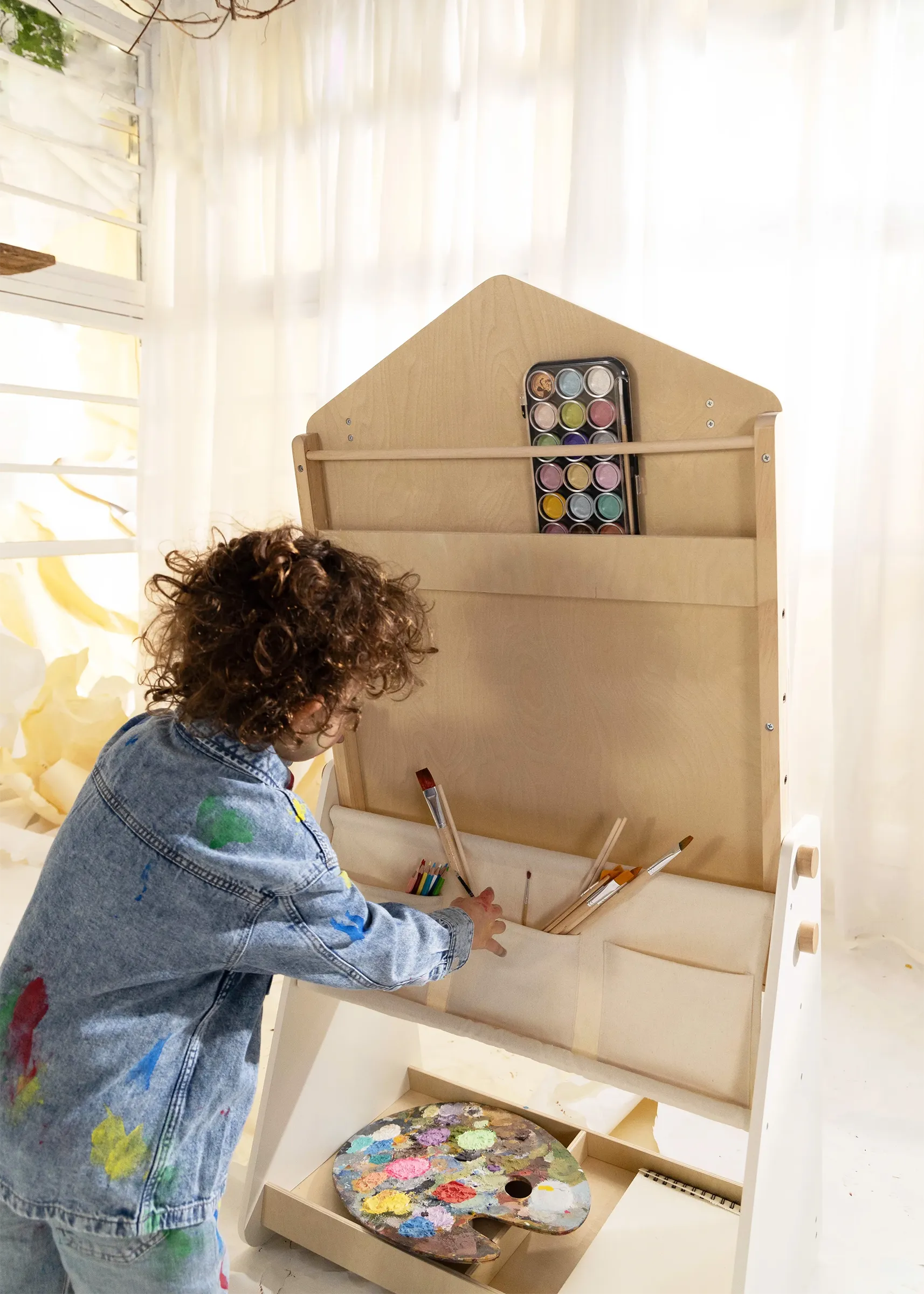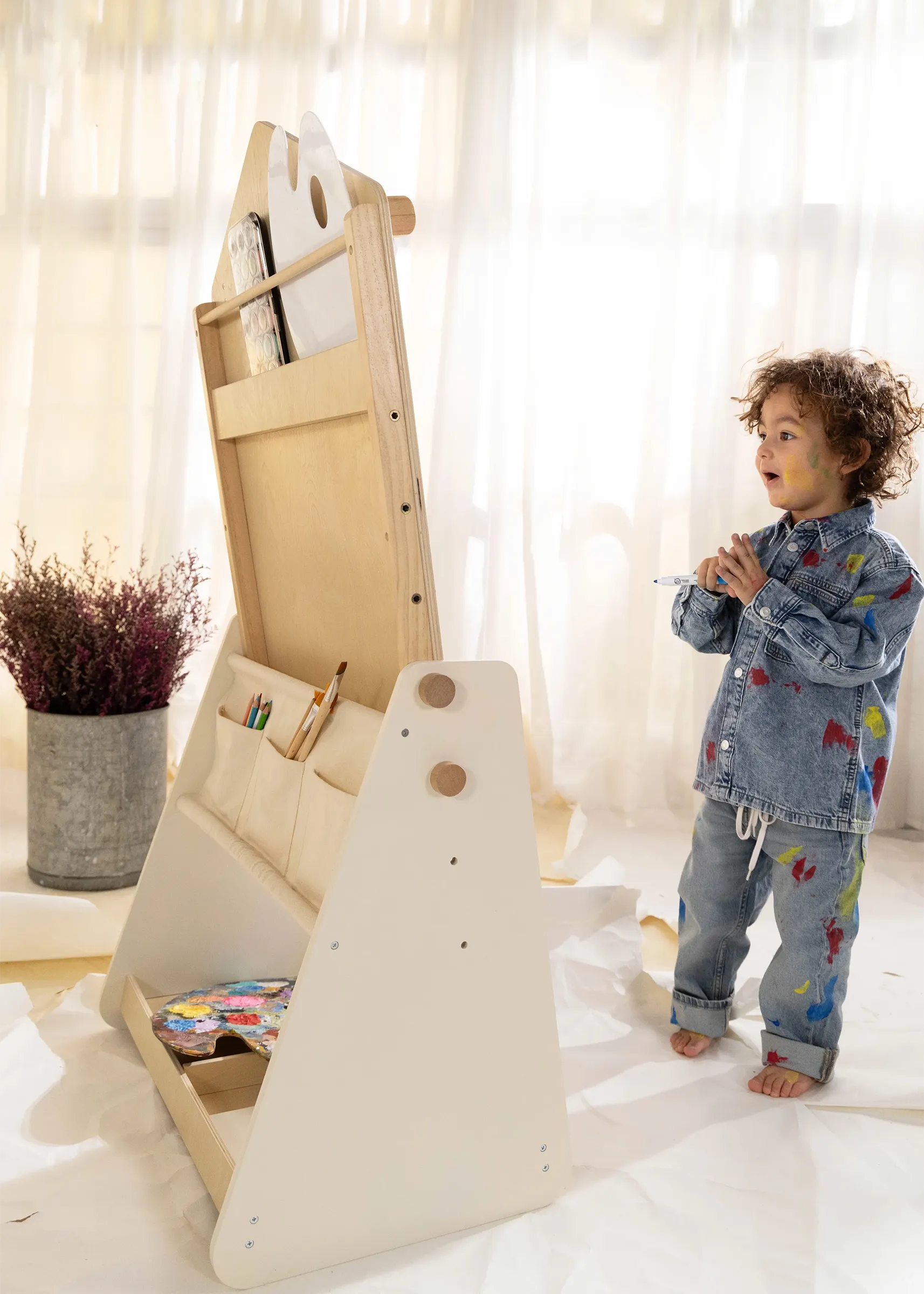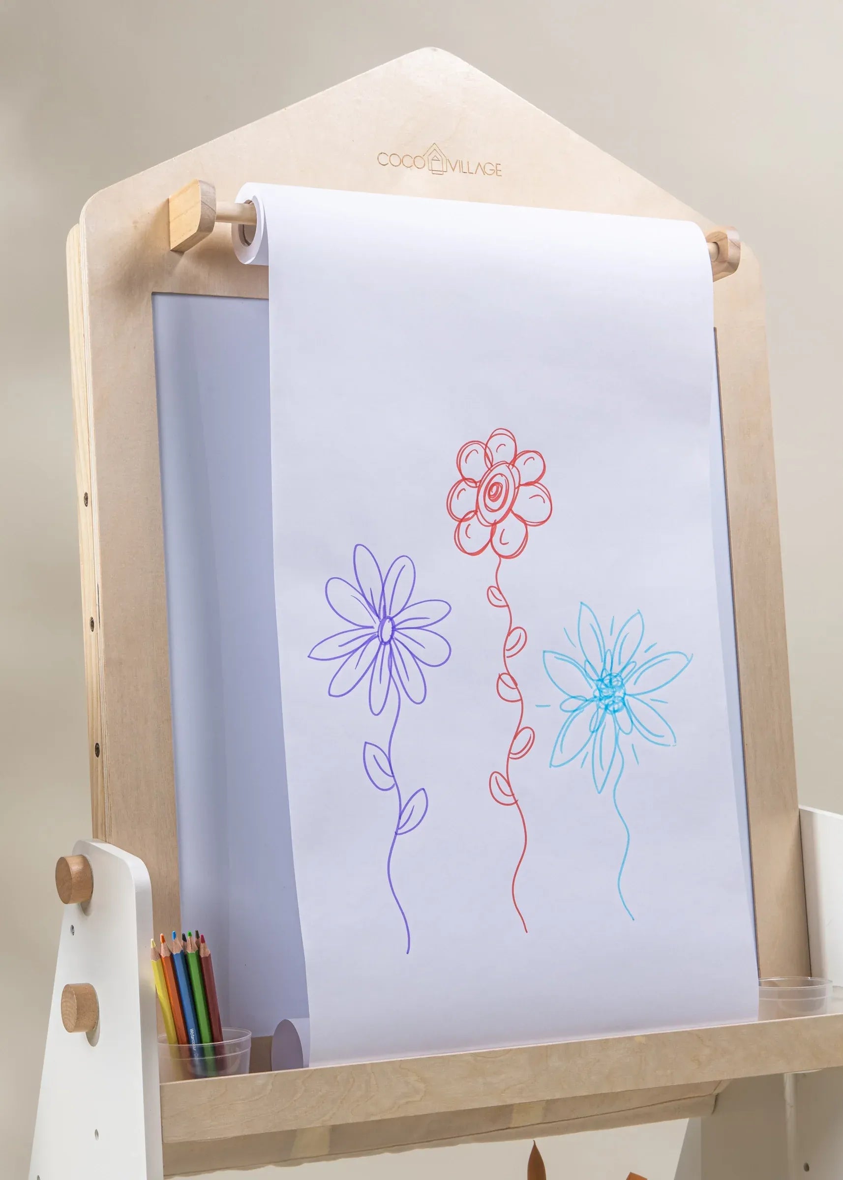Ce chevalet polyvalent encourage les enfants à explorer leur côté artistique, stimulants leur imagination et cultivant leur amour pour l’expression créative. Il aide au développement de la motricité fine, de la concentration et de la créativité, tout en offrant un espace ouvert pour le jeu et l'expression libre.