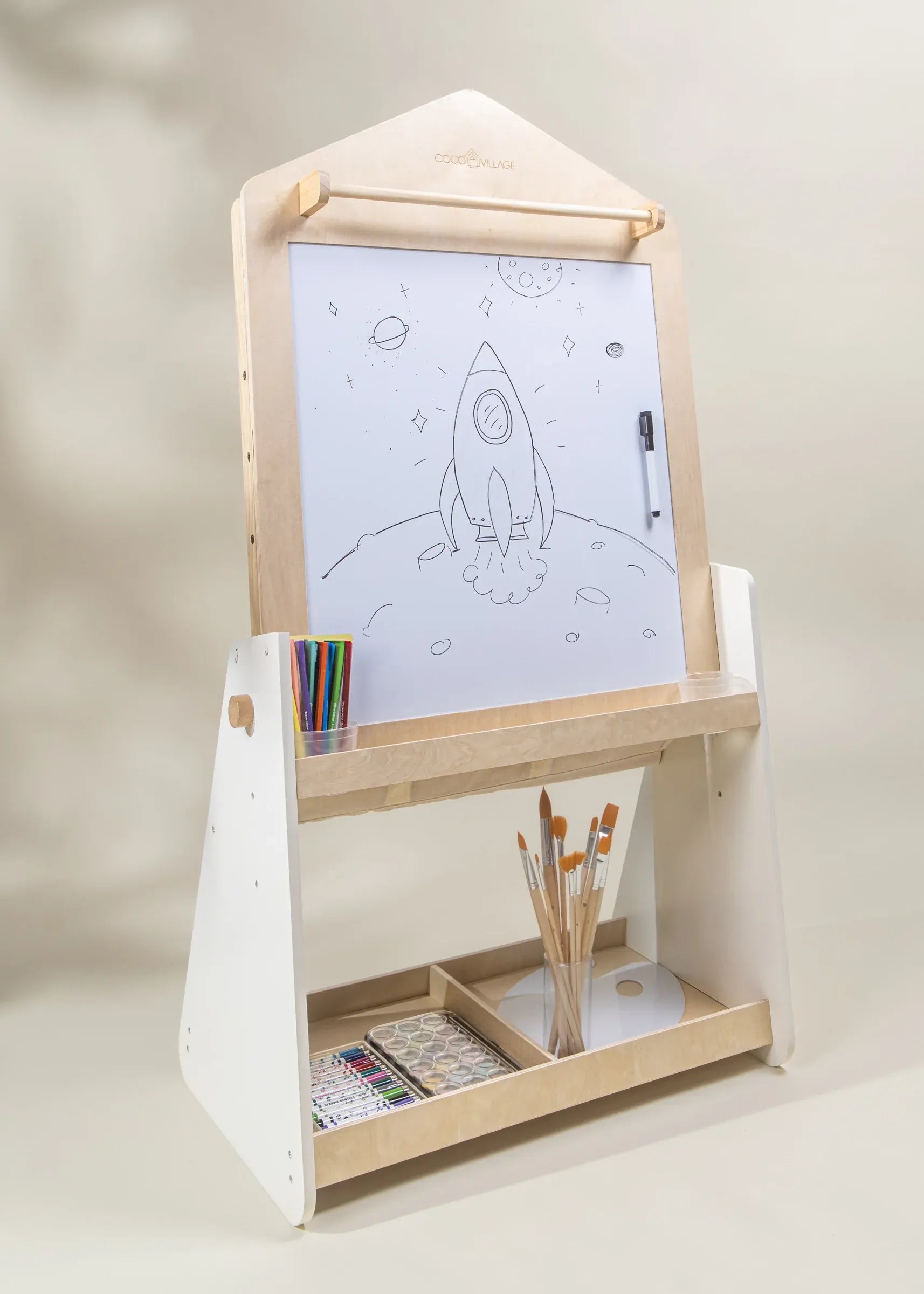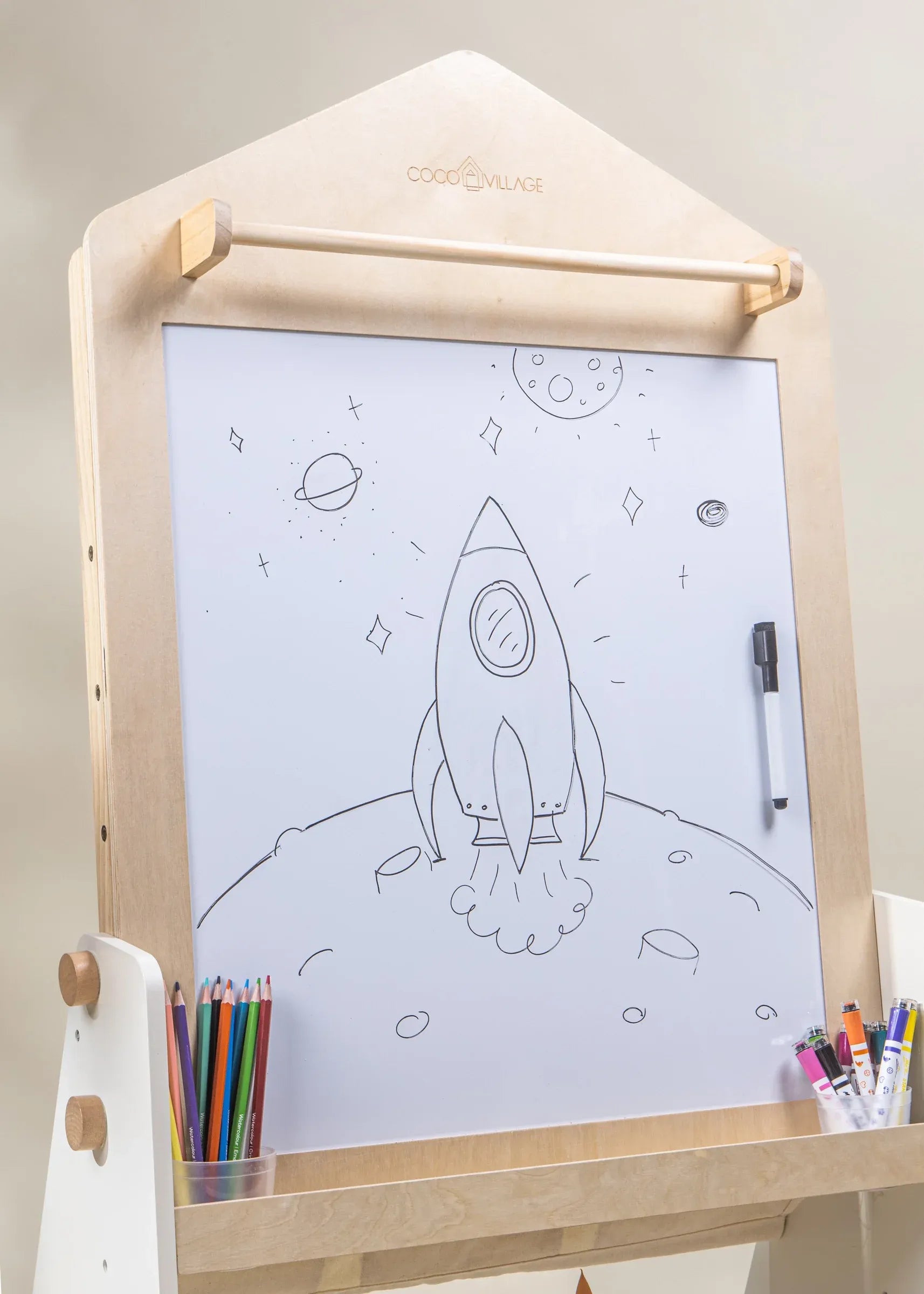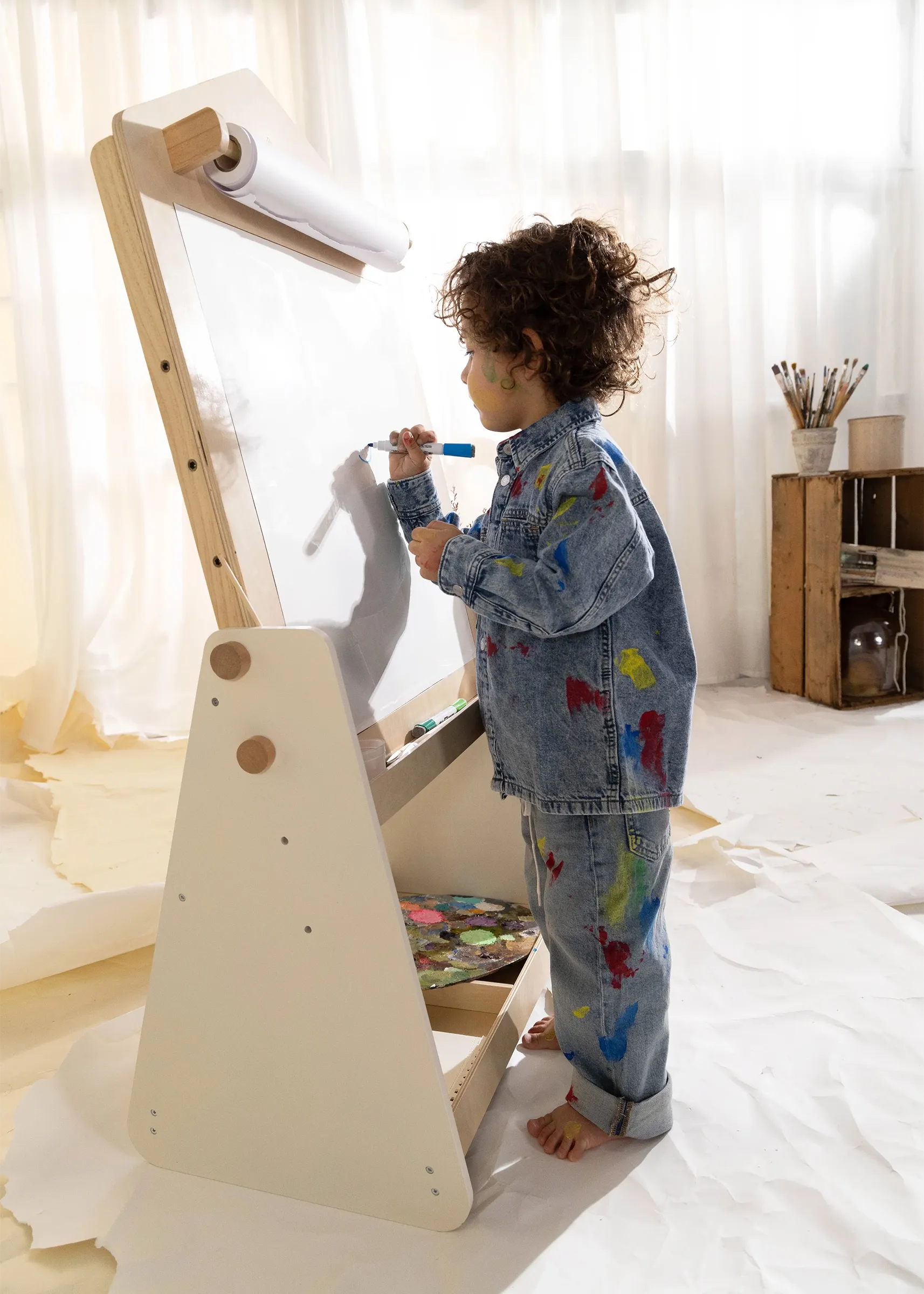 Le chevalet réglable en hauteur s’adapte aussi bien pour travailler assis que debout et peut accueillir des toiles de différentes tailles. Il dispose également d’un tableau blanc magnétique pour dessiner et exposer ses chefs-d'œuvre.