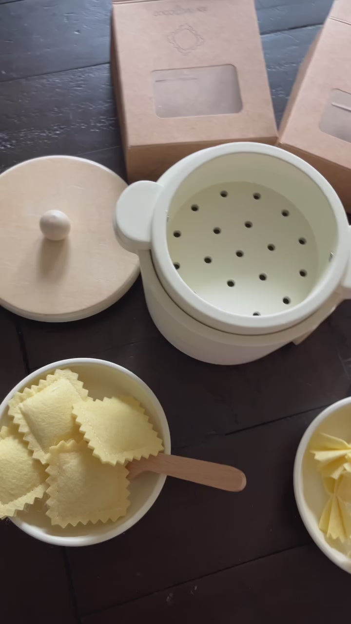Vous avez un amateur de pâtes dans la famille ? Notre Ensemble de Jeu Pâtes en Bois est l'ajout parfait à toute cuisine de jeu. Ce kit comprend une casserole à pâtes, une passoire, des pâtes réalistes en feutrine dans un emballage mignon, des bols à pâtes et des pinces, fournissant tout ce dont votre petit chef a besoin pour créer le plat de pâtes parfait.