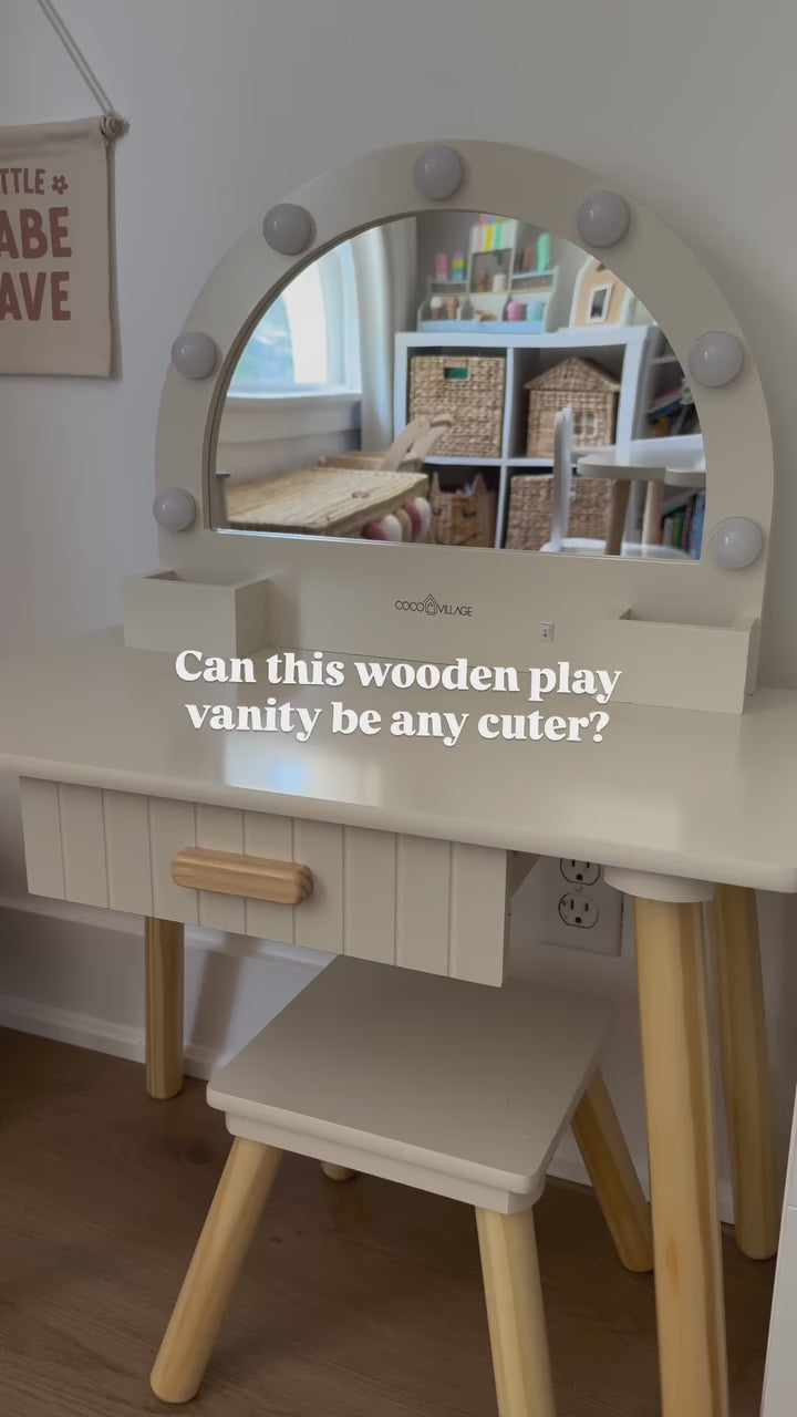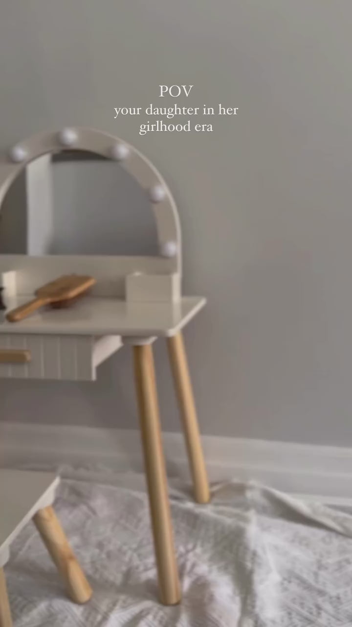 L'ensemble comprend un tabouret assorti ainsi qu’un miroir lumineux doté de douces lumières LED, alimentées par piles, pour offrir à votre enfant une véritable expérience de salon.