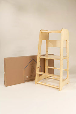 The protective safety bar keeps little ones secure while they play and explore. The maximum capacity is 66 lbs (30 kg), ensuring sturdy and reliable support. The adjustable steps allow the tower to grow with your child, providing comfort and adaptability. The stabilizing legs ensure perfect balance and safety during daily use.