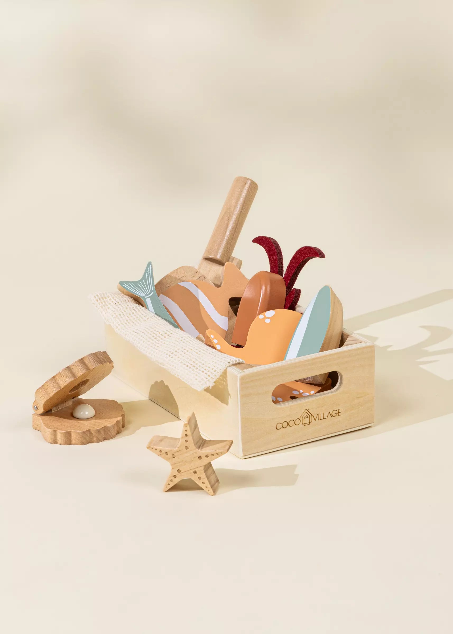 - Wooden Seafood Playset – A colorful set of wooden seafood items and accessories for slicing, sorting and serving.